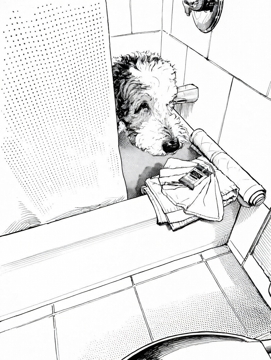 The incident was first reported when this correspondent, waking to find the dog absent from his usual sleeping location, conducted a room-by-room search. Zuki was located in the bathroom. He was not bathing. He was not drinking from the faucet. He was standing upright in the center of the tub, facing the door, and appeared to be waiting for someone to arrive and account for the situation.
